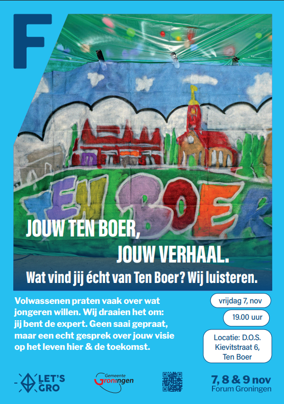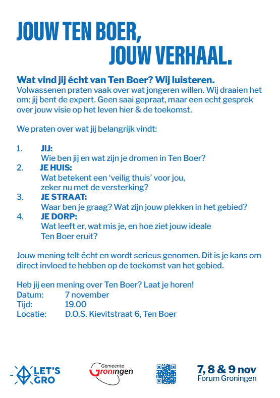 Op vrijdag 7 november organiseert het gebiedsteam een avond voor jongeren rondom het Toekomstprogramma Ten Boer. Wij willen van jongeren horen wat hun wensen en ideeën voor de toekomst van het gebied.